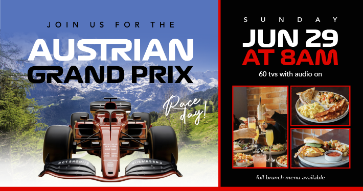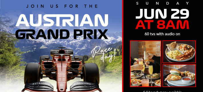 Watch your favorite teams and drivers battle it out in the scenic Austrian mountains, shown on 60 TVs with full audio. Whether you’re cheering for Verstappen, Leclerc, or pulling for an underdog, there’s no better place to watch every twist, turn, and pit stop.