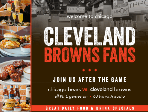 Whether you’re rolling into Chicago for the big matchup or you’re a loyal Browns fan living in enemy territory, THEORY is your go-to spot for the ultimate tailgate experience – before, during, AND after the game.