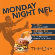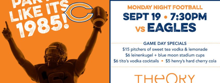 Looking to party like its 1985? Theory is your spot. September 19th vs the Eagles for Monday Night Football, kickoff at 7:30PM. Reserve your table today and cheer your team on one of over 30 TV’s, there truly is no bad seat in the house. Amazing food and drink specials make Theory the ultimate spot to cheer the Bears on.
