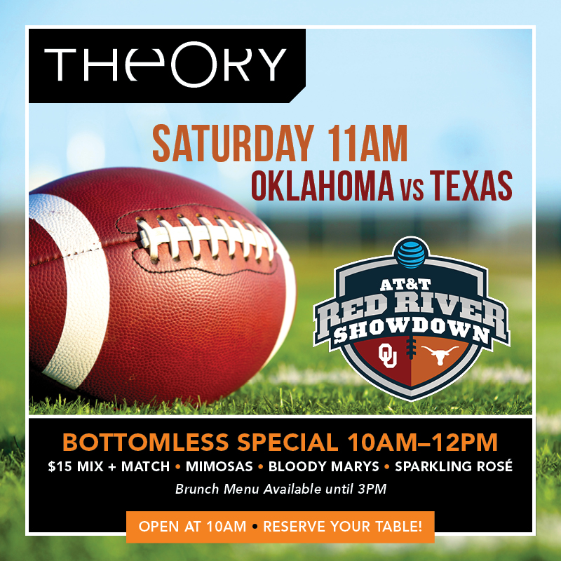 The rivalry game between the University of Texas Longhorns and the University of Oklahoma Sooners will kick off at 11AM Saturday. And you’re invited to watch the action here at Theory!