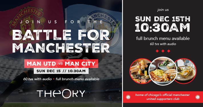 Theory is proud to be the home for Manchester United fans in Chicago. Decked out in red and buzzing with passionate supporters, we’ll be singing, chanting, and cheering for every moment of the match. But don’t worry, City fans – you’re more than welcome to join the fun, too! Soccer is all about passion, and we embrace it here, no matter your colors.