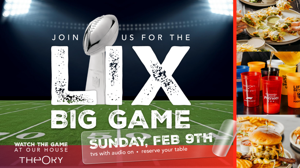 Super Bowl Sunday only comes once a year, so don’t settle for anything less than the best. Make Theory Sports Bar your go-to spot for the big game. Bring your friends, enjoy incredible food and drinks, and make this Super Bowl one for the books.