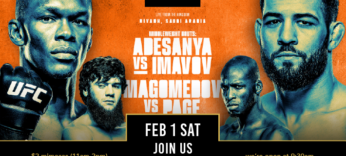 Get ready for a high-octane Saturday as UFC Fight Night delivers two explosive bouts, headlined by Israel Adesanya vs. Nassourdine Imavov and Magomed Magomedov vs. Michael Page. With doors opening early at 9:30 AM and drink specials that can’t be beat, Theory Chicago is your ultimate fight destination!